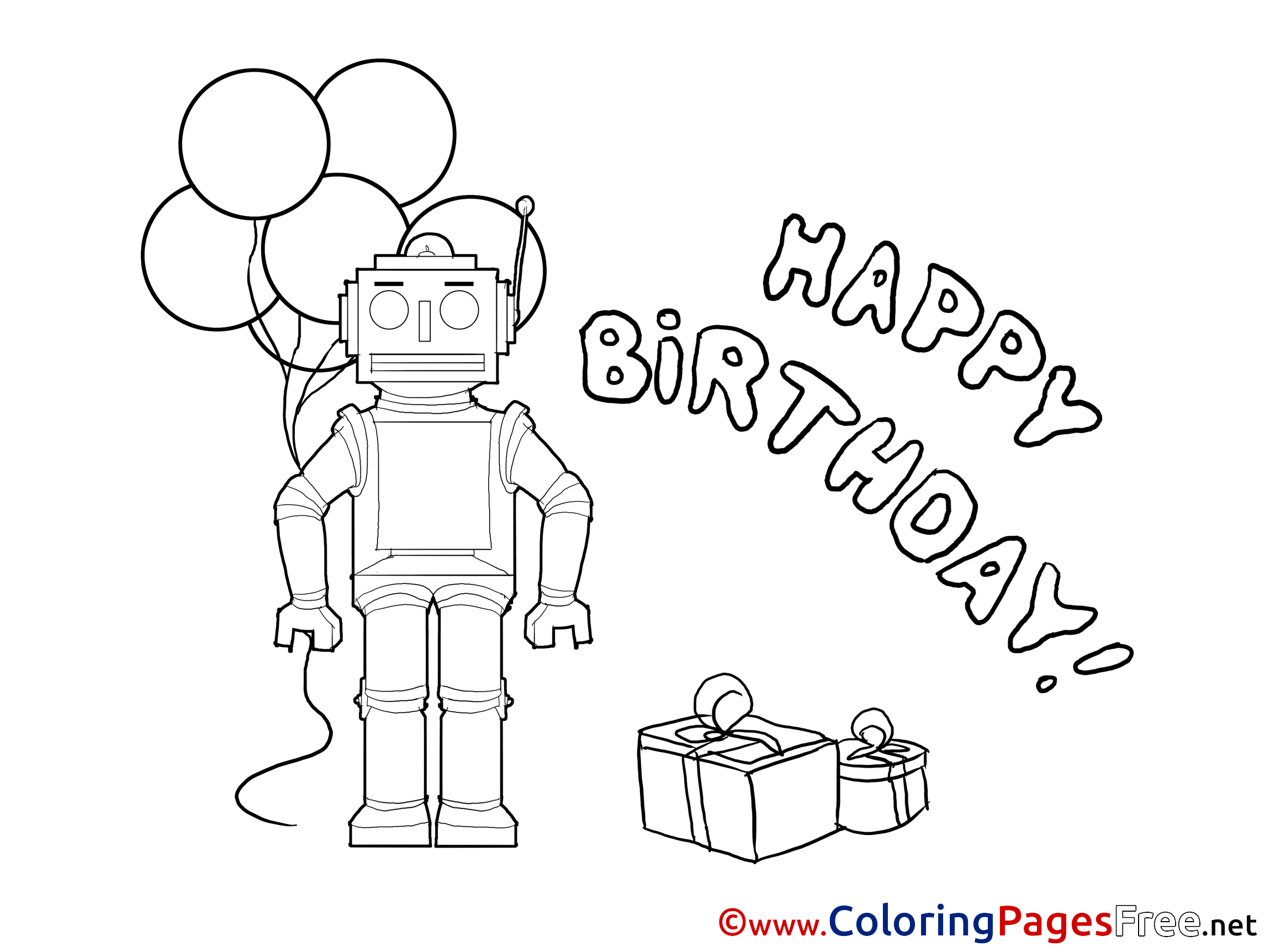 Title of Coloring Sheet: Robot Children Happy Birthday Colouring Page