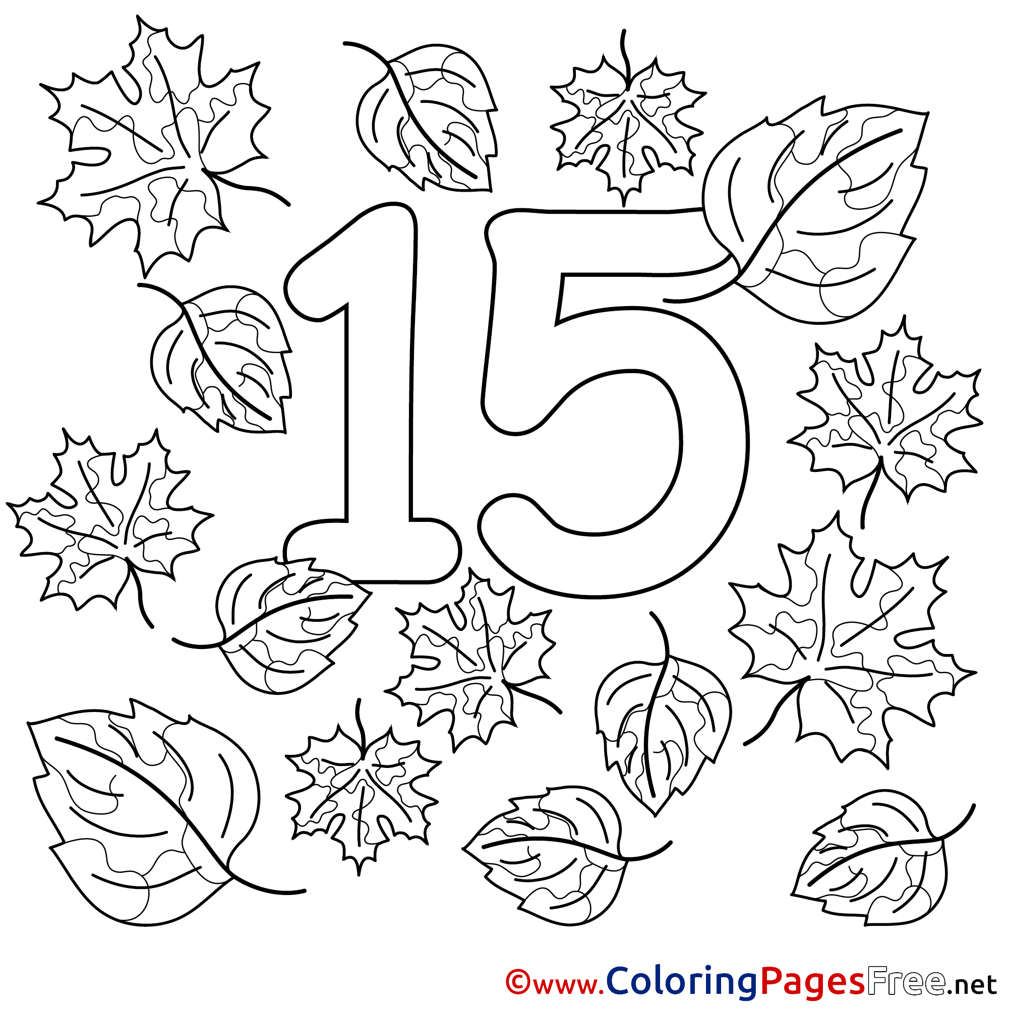 Title of Coloring Sheet: 15 Leaves Numbers Colouring Sheet free