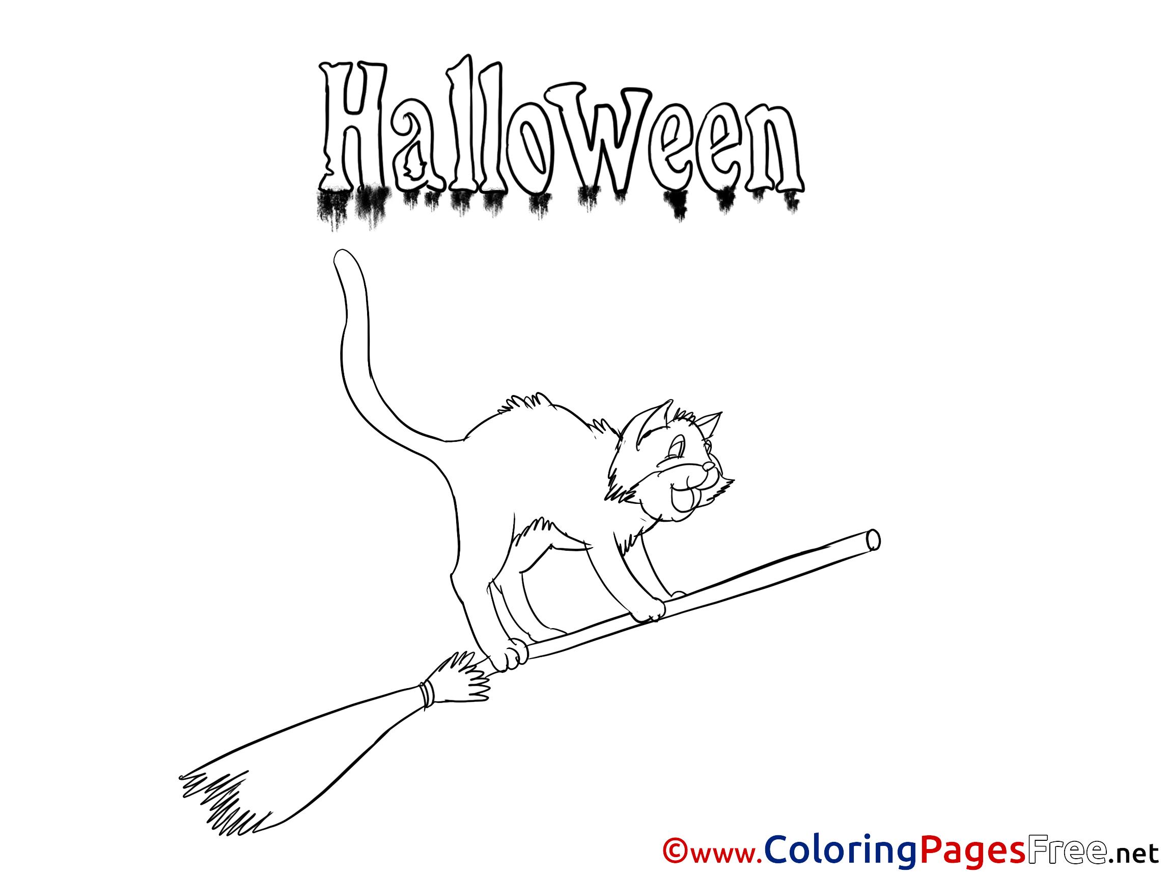 Free Cat on Broom Halloween Coloring Sheets